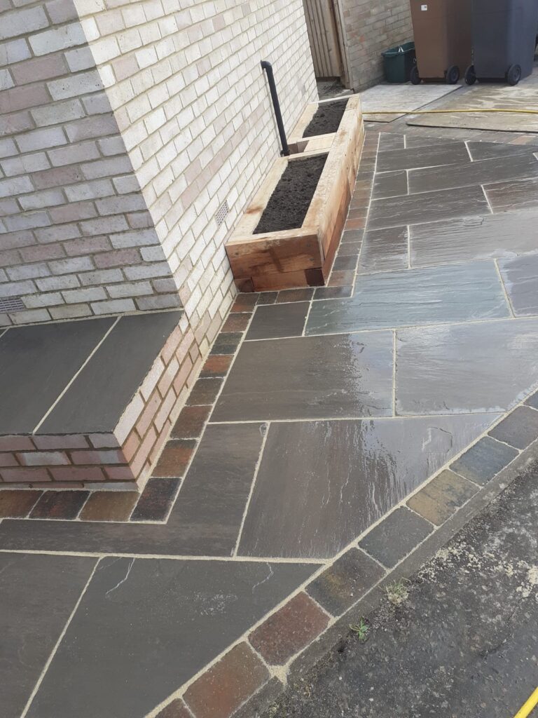 Part of a new house front in Chelmsford, Essex. Designed using Bradstone Indian Sandstone, a oak sleeper planter and a new wrap around step to the front door.